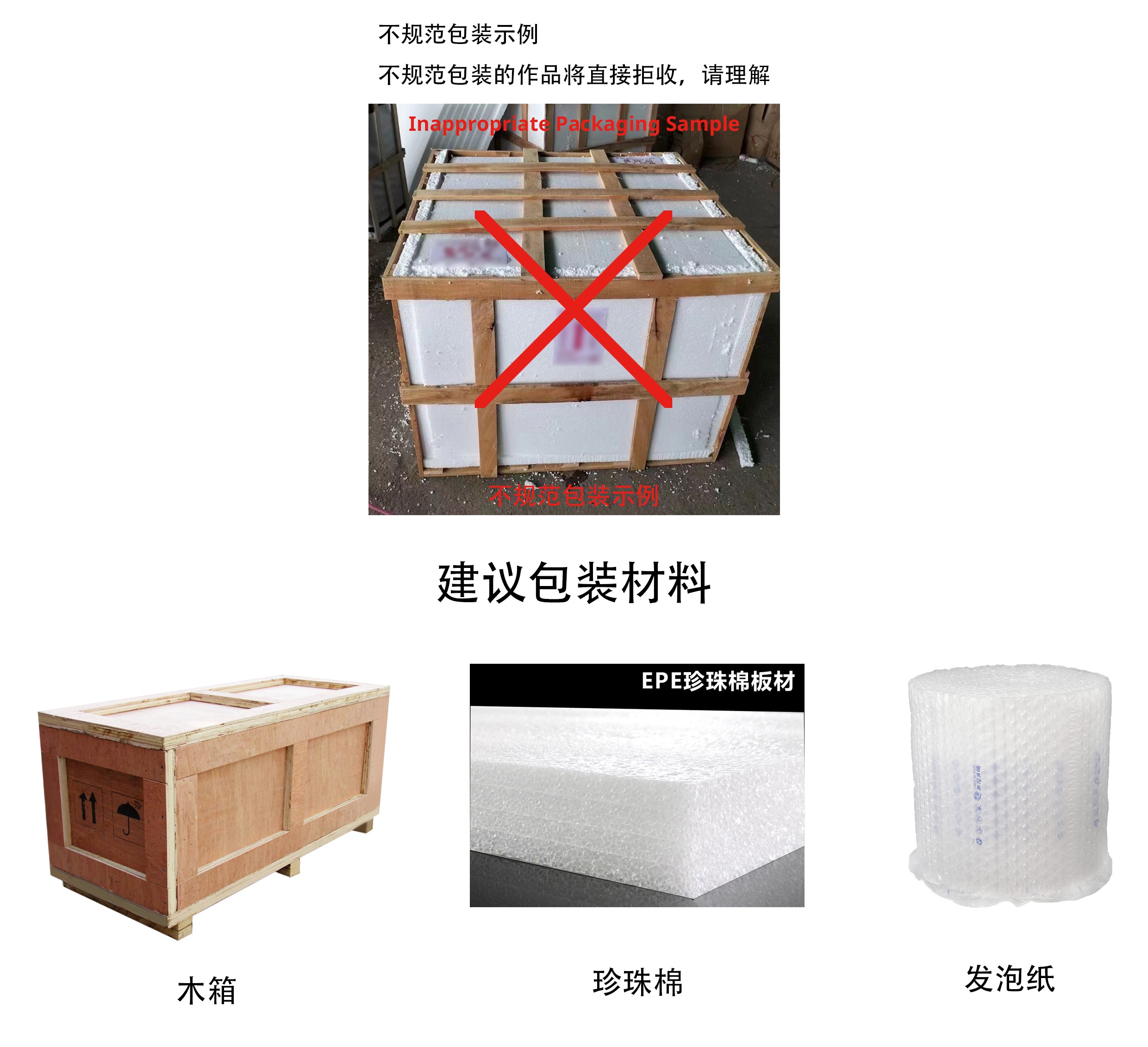 二、如不能親自將入圍作品送達的,請參展作者一律采用木質(zhì)包裝箱包裝作品寄送,箱內(nèi)務(wù)必放置填充物,且填充物要有一定厚度,以確保運輸途中安全性。