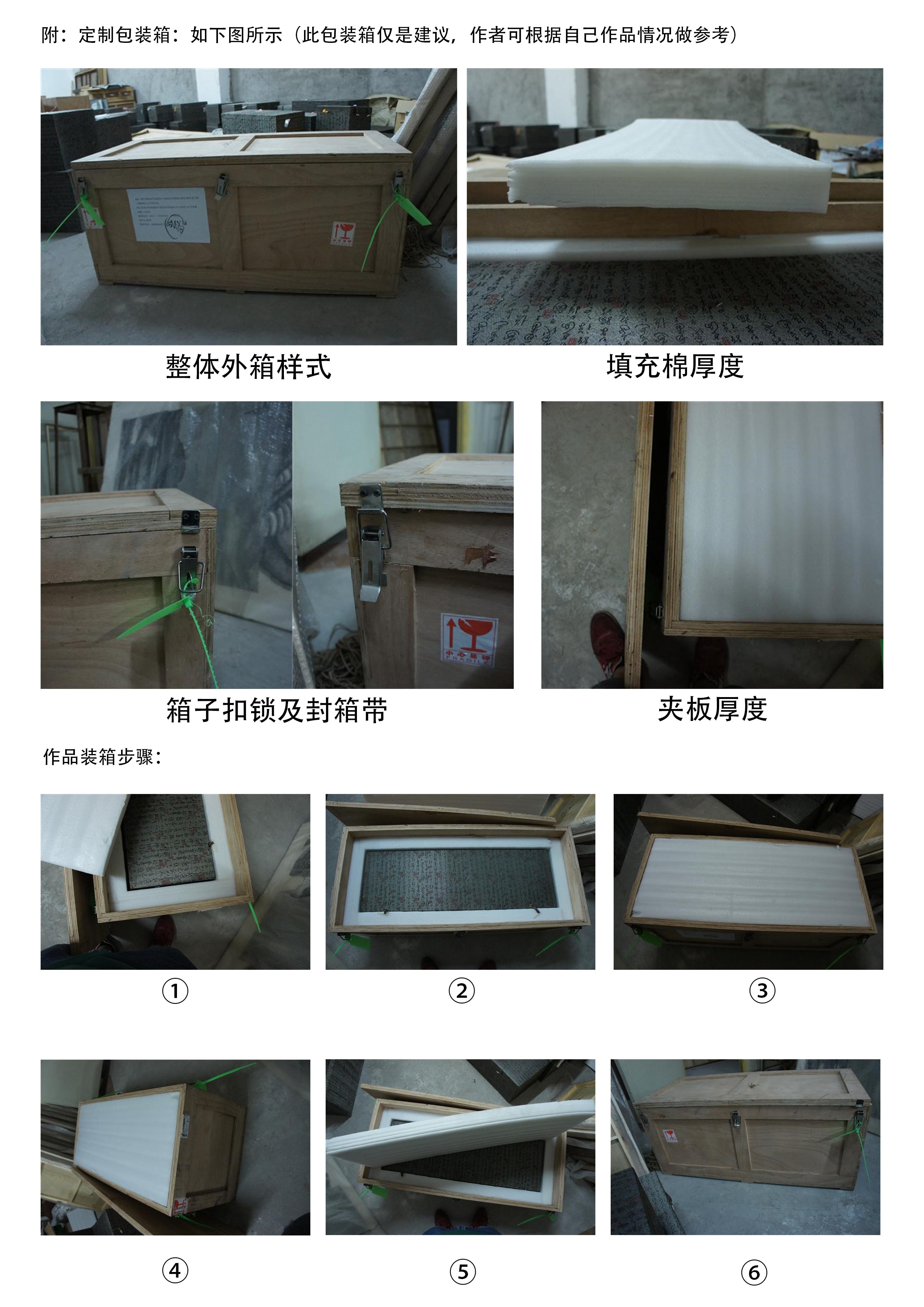 (四)有多件組合作品參展的作者,組委會建議每件作品用一個單獨的木質(zhì)包裝箱,并將所有木箱統(tǒng)一放置在一個木箱內(nèi)寄送,確保作品安全。